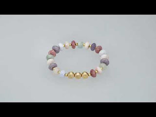 Das Pastel Dream Belonging Bracelet wird aus 18 Karat Gold und einer Kombination aus Morganit, rosa und violettem Turmalin sowie blauen Achat-Rondellen (jeweils behandelt) gefertigt und auf einem robusten Gummiband aufgezogen.