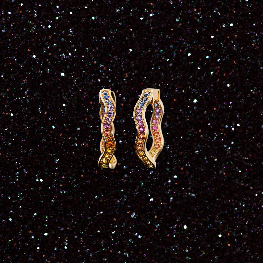 Crafted from 18ct yellow gold, the Rainbow EUPHORIA Hoops flaunt 36 fancy Sapphires totaling 1.9ct. About 2,5 x 1,5 cm.